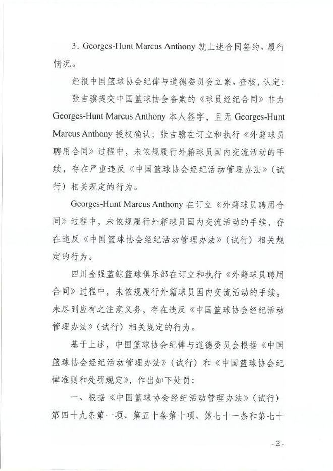 北京时间3月19日,中国篮协官方公布最新处罚结果,针对经纪人张吉骥、前四川外援亨特与四川男篮之间的球员合同纠纷进行调查确认合同违规,张吉骥的经纪人证书被吊销,四川男篮与外援亨特被严重警告。