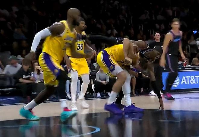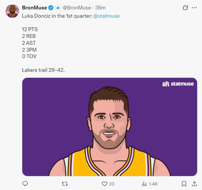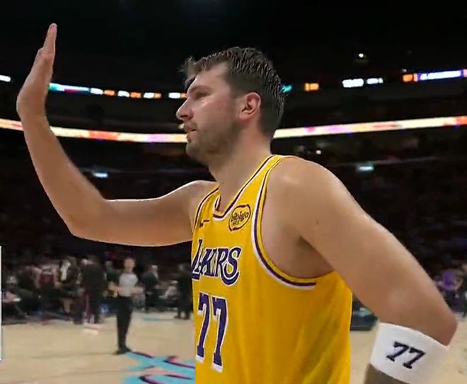 第三节开场仅仅5分钟,东契奇5中4,三分4中3连取11分1篮板2抢断帮助湖人完成反超。东契奇又现惊魂一幕,阿德巴约直接骑到了东契奇的背上,东子的腰部明显不适但他没有申请下场,三节打完东契奇24中13,三分14中7,拿到40分6篮板3助攻4抢断,单节拿到19分。