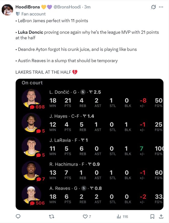 第二节的东契奇比首节还准,单节6分钟里7中4,三分2中1,拿到9分2篮板1抢断,东契奇的爆炸就是湖人将15分缩小到个位数的关键,东契奇半场18分钟拿到21分4篮板2助攻1抢断,命中率50%。