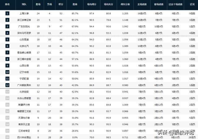 CBA最新排名:上海广厦争第一 广东前4不稳 中游球队排名大乱