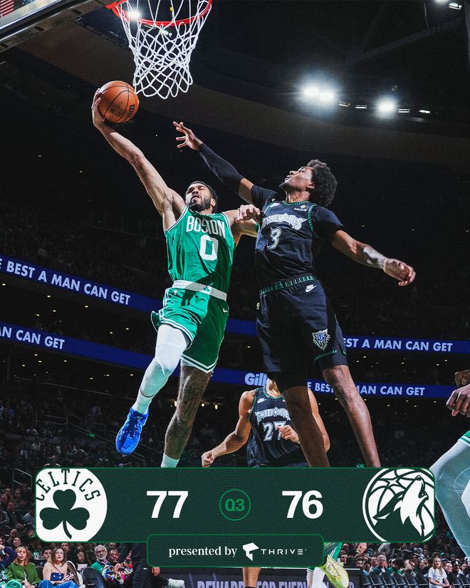 塔图姆在第三节开始后找到准星,独得7分,联手布朗、怀特打出11-0的攻击波,凯尔特人队以55-47重新领跑。麦克丹尼尔斯三分止血,多苏姆也连进两球,森林狼队追至54-58。布朗和普理查德回应5分再次拉开,麦克丹尼尔斯连进两球,布朗三分中的,戈贝尔和麦克丹尼尔斯又拿5分,本节还有4分15秒时森林狼队追至66-69。双方之后各得几分,里德打3分成功,海兰德跑投命中,三节结束时森林狼队以76-77落后1分。