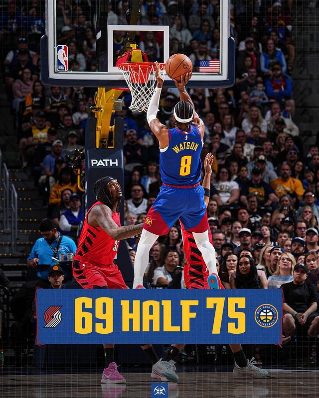 次节比赛,双方进攻火力均是出现下滑,但掘金连续两节单节得分30+。前4分钟掘金仅51-50领先开拓者,并在次节中段56-55领先,约基奇内线得分扩大65-58领先优势。掘金之后继续保持微弱领先优势,掘金单节33-29净胜4分,上半场比赛结束掘金扩大75-69领先开拓者。前两节比赛,约基奇13+10+8、穆雷18分与卡约14分,克林根16+6、阿夫迪亚9分10助攻与罗威12分。