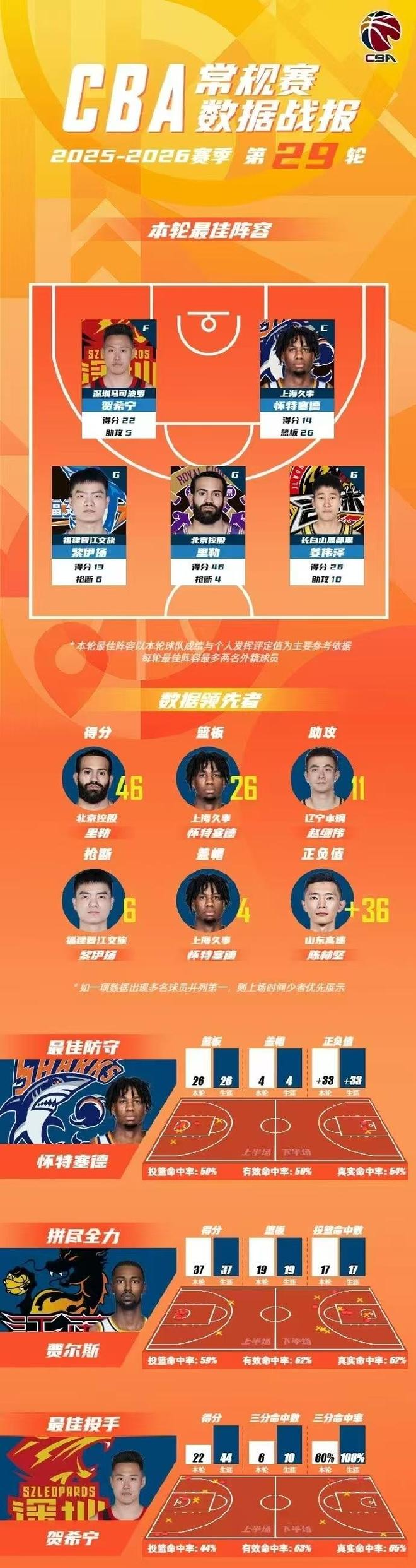CBA官方公布常规赛第29轮最佳阵容,怀特塞德14分26篮板统治内线,率领上海三杀广东豪取10连胜,姜伟泽26+10率领吉林15分逆转爆冷险胜北京,黎伊扬、里勒与贺希宁也入选。