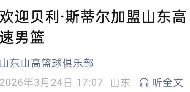 山东高速男篮官方:贝利·斯蒂尔加盟 有望4月1日完成首秀