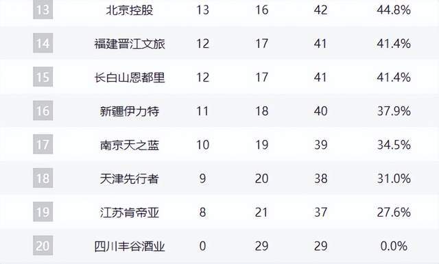 青岛队(17胜12负)与浙江队(16胜13负)分列第七、第八,季后赛门槛清晰可见。宁波队(15胜14负)与山西队(15胜14负)同分,位列第十、十一,竞争激烈。广州队(13胜16负)以微弱优势守住第十二位,成为季后赛“守门员”。北控、福建、新疆、吉林等队仍存理论晋级希望,竞争格局高度开放。