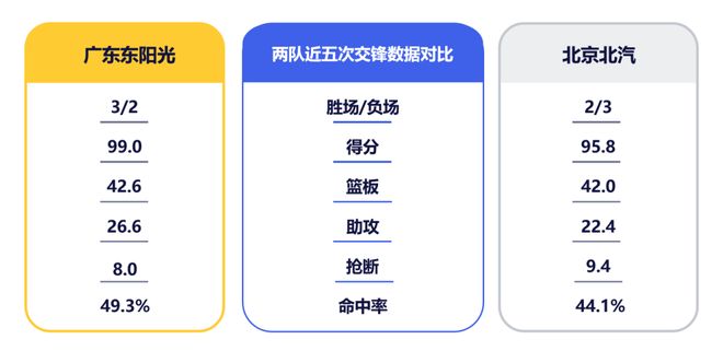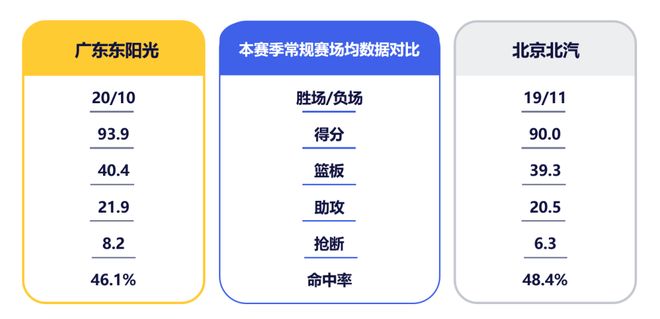 北京队进攻效率排在联盟第二,三分命中率更高居联盟之首,有8人场均得分上双,广东队此战在防守端又将迎来考验。北京队后场双星近期状态火热,赵睿在与辽宁一战中独得34分,并与麦基形成良好的化学反应,近三场比赛助攻数逐渐走高。而首回合缺阵的陈盈骏近五场比赛三分命中率均突破40%。此役,广东队后场如何做出应对,将是一大看点。