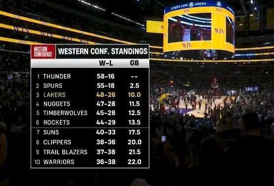 湖人继续领先掘金1.5胜场、领先森林狼2.5胜场、领先火箭3.5胜场。