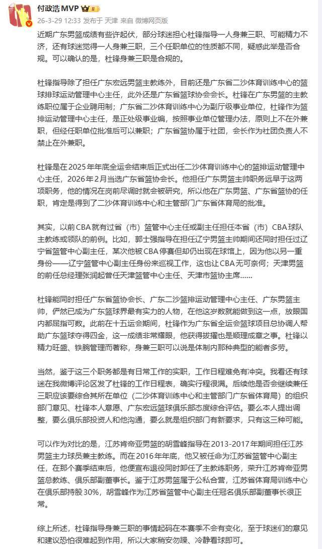 北京时间3月29日消息,杜锋目前同时担任广东宏远男篮主教练、广东省二沙体育训练中心篮球排球运动管理中心主任、广东省篮球协会会长三项职务,引发外界对其精力分配与任职合规性的广泛讨论。名记付政浩老师,就从职务性质与制度框架给出了自己的答案,并举出了历史先例,足以说明,其任职结构符合现行管理规范,不存在程序性违规。