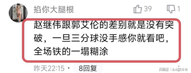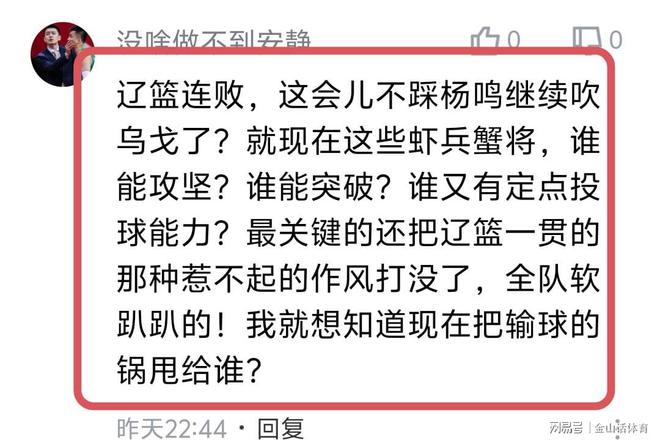 辽宁队4大主力糟糕的表现,赛后也被球迷们纷纷吐槽。“辽宁一群人真像一群无头苍蝇。”;“赵继伟跟郭艾伦的差别就是没有突破,一旦三分球没手感你就看吧,全场铁的一塌糊涂”;“三个后卫总共20中3,打毛线,一人一球”;“辽篮连败,这会儿不踩杨鸣继续吹乌戈了?就现在这些虾兵蟹将,谁能攻坚?谁能突破?谁又有定点投球能力?最关键的还把辽篮一贯的那种惹不起的作风打没了,全队软趴趴的!我就想知道现在把输球的锅甩给谁?”;“辽宁解散吧,可别丢人了,一盘散沙”……