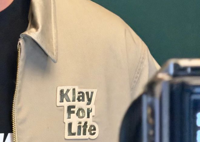 汤普森身穿定制款“Klay For Life(克莱一生)”外套,全程笑容满面。