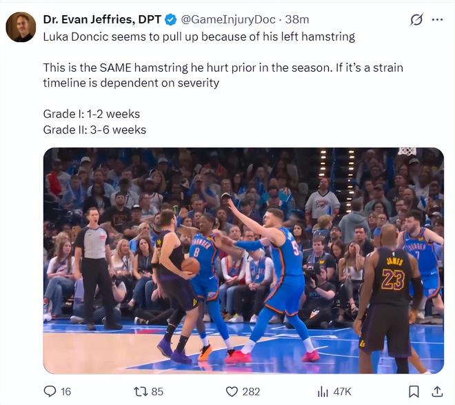 根据医学专家埃文-杰弗里斯的分析,东契奇应该是因为左腿筋的问题提前停下来,这正是他本赛季之前受伤的同一侧腿筋,如果还是拉伤恢复时间取决于严重程度:一级拉伤需要1-2周、二级拉伤需要3-6周。