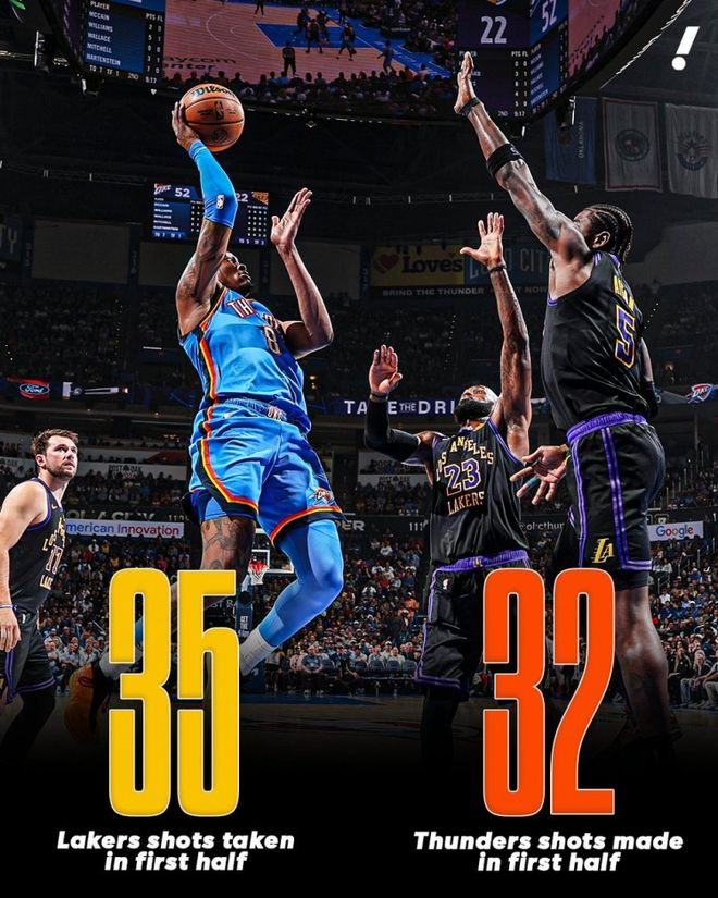 第十二,雷霆上半场甩进32球,限制湖人只出手35次。