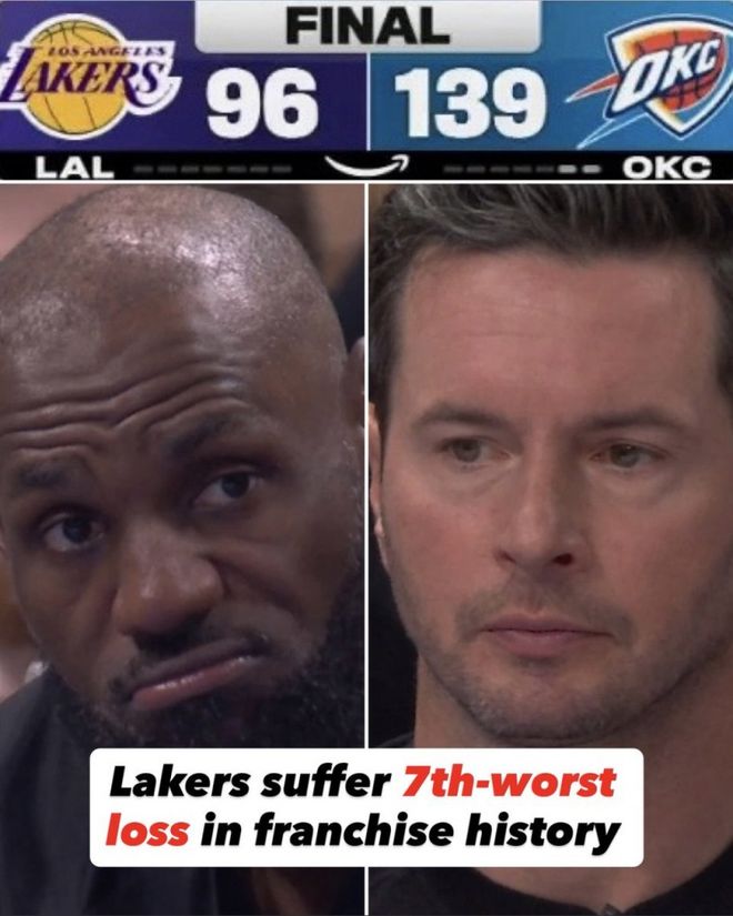 首先,湖人惨败雷霆43分,也创造了队史第七大失利分差。