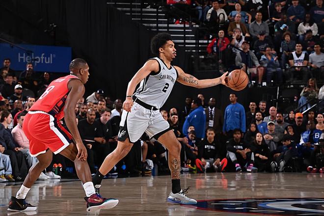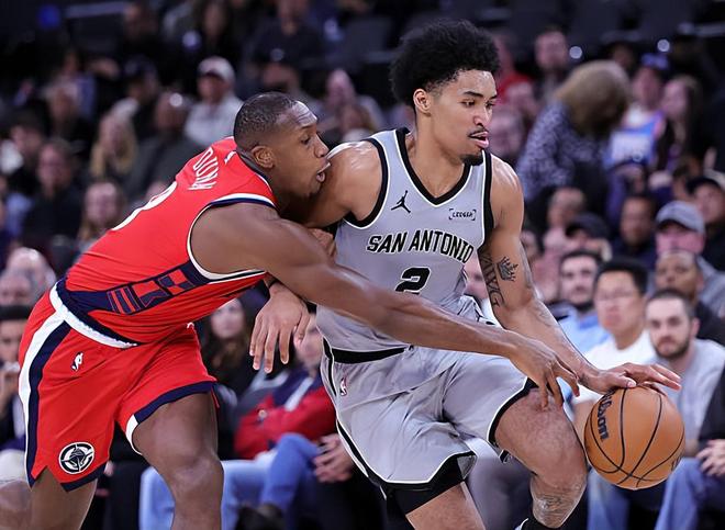 本场比赛中,马刺的替补后场新秀迪伦-哈珀(Dylan Harper)的表现算得上是令人刮目相看。哈珀全场出场25分01秒,投篮12中8,三分线外3中2,罚球1中1,以超高的效率得到了19分2篮板5助攻1抢断的数据,还有2次失误和4次犯规,正负值为+11。哈珀在进攻端展现出了自己全面的得分能力,他有着相当不错的突破能力和终结能力,他也展现出了自己在外线投篮方面的稳定性,而且他在传球和组织方面的表现也是令人眼前一亮的。除此之外,哈珀在防守端的表现也算是中规中矩,也没有出现什么太大的问题。总体来看,哈珀在本场比赛中算是展现出了自己全面的个人能力,并且为球队的这场大胜做出了不小的贡献。