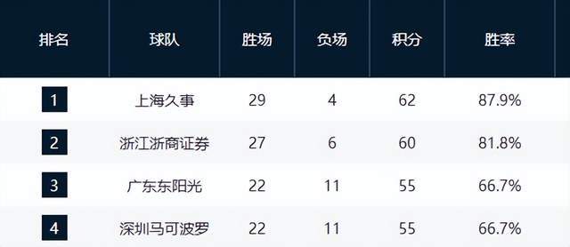 与之形成鲜明对比的是,广东队状态回暖,深圳队火力全开,山东队双新援渐入佳境,三队均展现出强劲上升势头,成为冲击前四的有力竞争者。青岛与浙江延续连胜势头,分别稳居第五、第六,紧咬北京,随时可能完成反超。