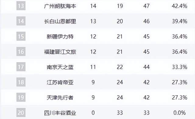 更令人意外的是,广州、吉林、新疆、福建四队仍紧咬北控,理论上保留晋级可能;但同曦、江苏、天津三队持续连败,四川队更已吞下33连败,创下CBA历史最差纪录。多队陷入“赢不了、输不起”的泥潭,季后赛席位争夺正从“群雄逐鹿”转向“少数突围”。