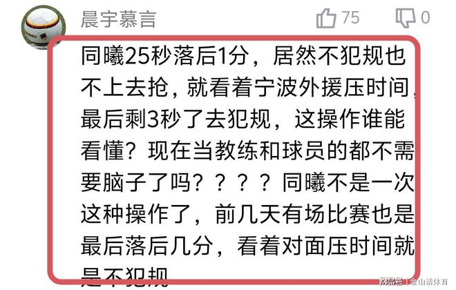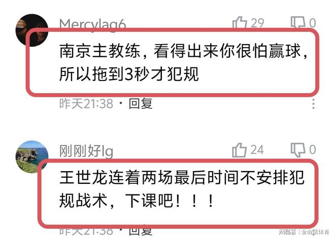 同曦主帅王世龙连续2场犯低级错误,赛后也被球迷纷纷吐槽。“同曦25秒落后1分,居然不犯规也不上去抢,就看着宁波外援压时间,最后剩3秒了去犯规,这操作谁能看懂?现在当教练和球员的都不需要脑子了吗?”:“”同曦不是一次这种操作了,前几天有场比赛也是最后落后几分,看着对面压时间就是不犯规”;“南京主教练,看得出来你很怕赢球,所以拖到3秒才犯规”;“王世龙连着两场最后时间不安排犯规战术,下课吧!”……