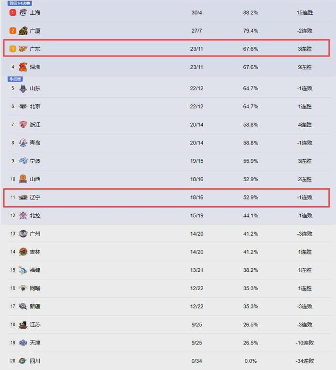 深圳绝杀北控豪取9连胜目前稳定在第四!这赛季最大惊喜就是深圳和宁波,这两队表现不输一些豪门,也期待他们在季后赛舞台大施拳脚。而辽宁的处境和广东是冰火两重天!较为尴尬。球队已失去冲击前6希望,本轮又被山西反超,排名跌至第十一。虽然暂时没有下滑风险,但99.9%会锁定在附加赛区,常规赛最终排名预估在第7至第11名之间。最后,便是北控、广州、吉林福建以及同曦这五支球队来争取附加赛第12名的最后一个名额。
