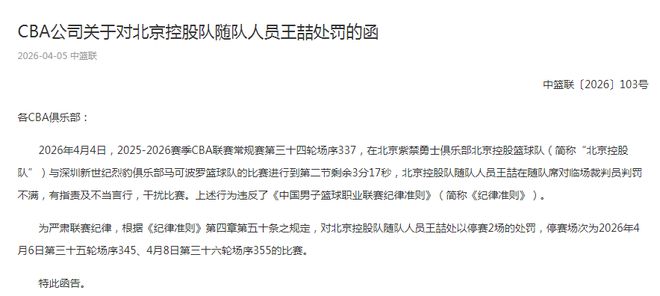 王喆的上述行为违反《中国男子篮球职业联赛纪律准则》,为严肃联赛纪律,根据《纪律准则》第四章第五十条之规定,对北控随队人员王喆处以停赛2场的处罚,停赛场次为2026年4月6日第三十五轮场序345、4月8日第三十六轮场序355的比赛。