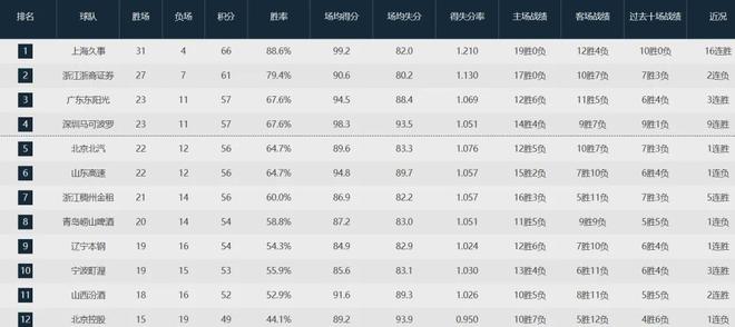 目前为止,广东队以23胜11负排名联盟第三,落后上海队(31-4)和广厦队(27-7)。