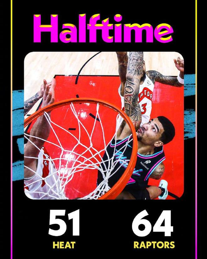 次节比赛,猛龙连续两节单节得分30+,且限制热火连续两节不足30分。热火率先一波9-2攻势反超2分,猛龙多点开花一波19-4攻势反超13分,猛龙随后持续压制热火,逐步扩大64-47领先优势。热火连追4分,猛龙单节32-24净胜8分,上半场结束猛龙64-51领先热火。前两节比赛,热火三分24中6,维金斯11分与阿德巴约6中1(三分5中0)仅得到4+6+2;猛龙三分15中7,英格拉姆15分与巴恩斯14分。