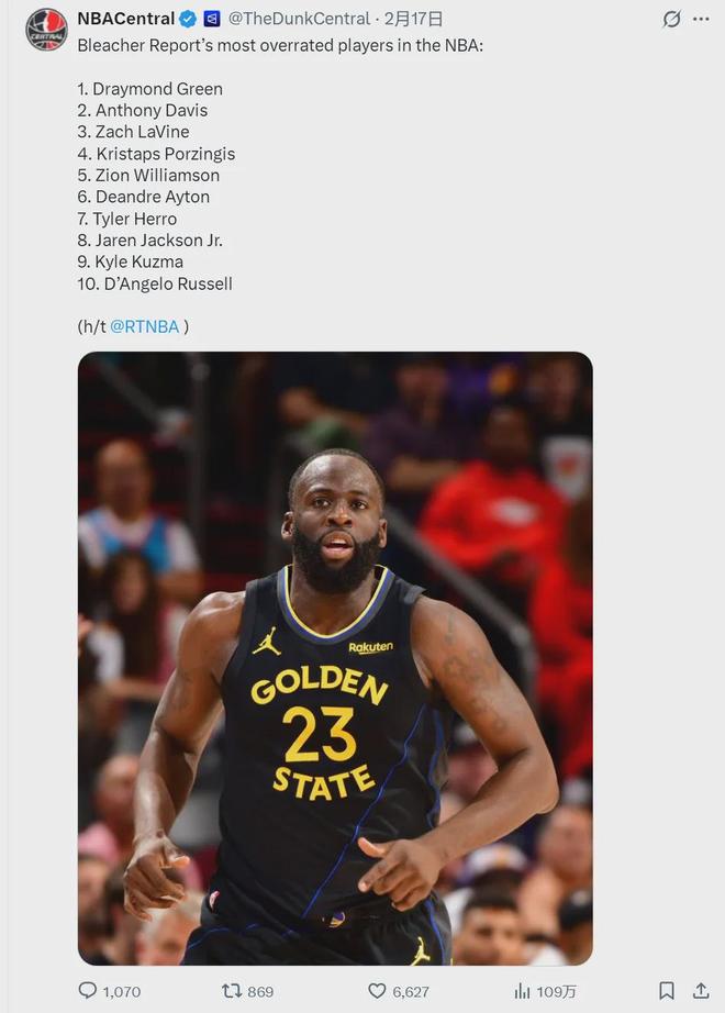 追梦本赛季场均正负值-0.3,联盟第147位!11次技术犯规,联盟第4;3次恶意犯规,同样联盟第4;2次被驱逐出场,高居联盟第1。真实命中率52.9%,联盟第293位。美国露天看台(BR)评选联盟十大被高估球员,追梦排名第一。
