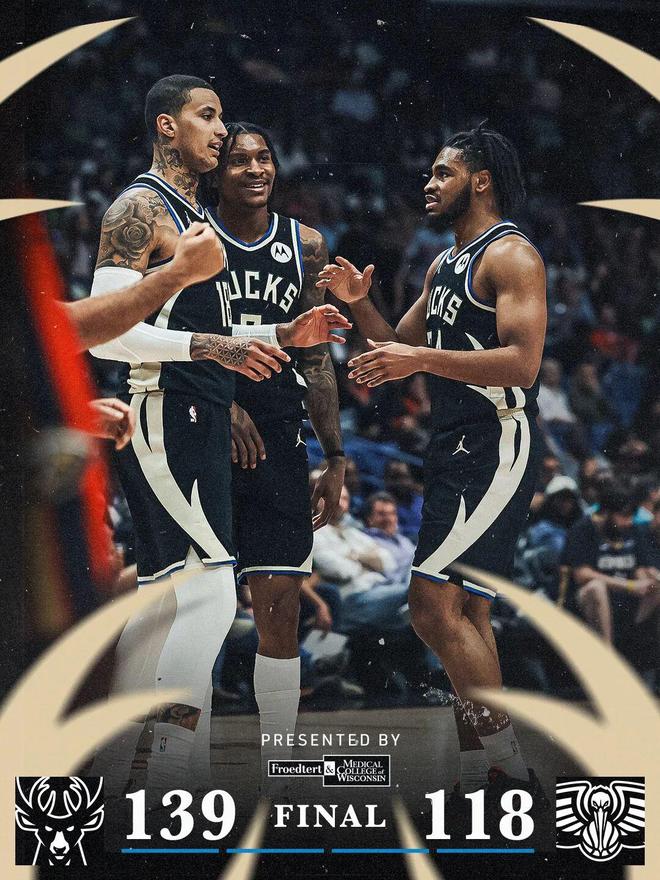 常规赛,雄鹿客场139-118战胜鹈鹕。