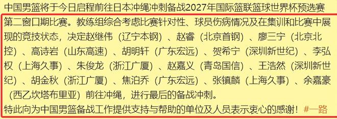 北京时间2月23日,是中国男篮出发前往日本的日子,与此同时,中国男篮也正式官宣了入选此次世界杯预选赛的14人名单。分别是后卫赵睿、赵继伟、廖三宁、胡明轩和高诗岩;锋线球员张镇麟、朱俊龙、贺希宁、王浩然、李弘权和赵嘉义;内线球员胡金秋、焦泊乔和余嘉豪。