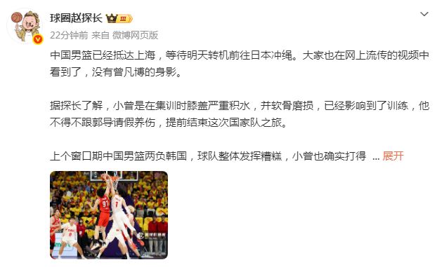 北京时间2月22日,中国男篮主力锋线曾凡博将因伤无缘第二窗口期世预赛,根据媒体人球圈赵探长报道,曾凡博是因为膝盖严重积水并软骨磨损,已影响训练,已请假离队养伤。