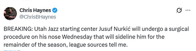 北京时间2月24日,据名记Haynes报道,犹他爵士队中锋努尔基奇将于明日接受鼻子手术,赛季报销。努尔基奇几年前鼻子骨折后,一直饱受呼吸和睡眠问题的困扰。