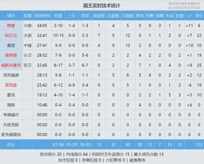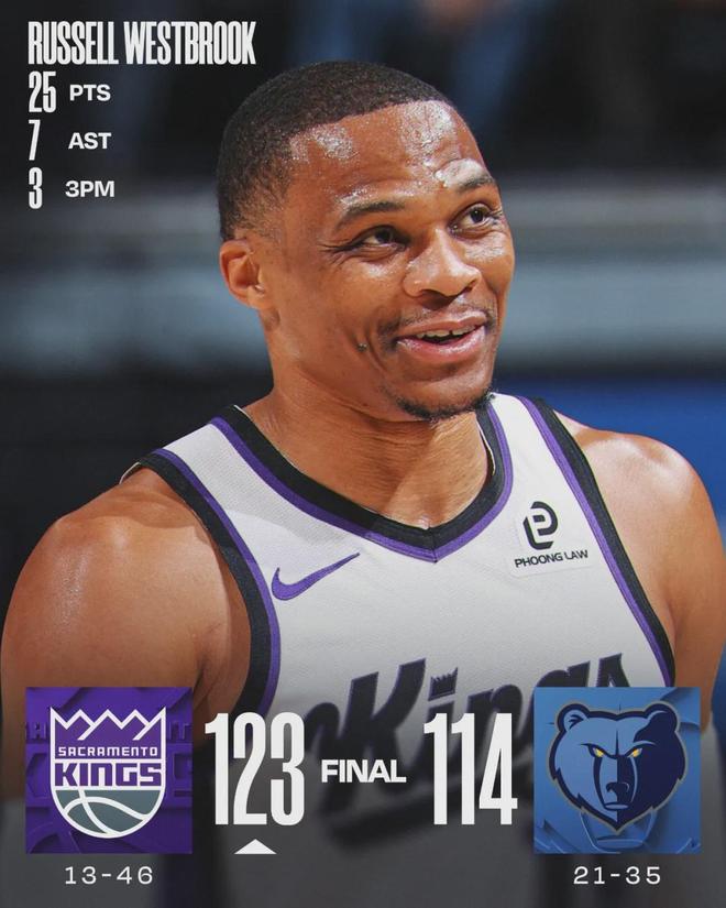 国王后卫拉塞尔-威斯布鲁克出战32分钟,投篮17中8,三分7中3,罚球7中6,得到25分2篮板7助攻1抢断,正负值+9。国王内线阿丘瓦15中10,得到22分12篮板。德罗赞9投7中,高效率砍下19分2篮板4助攻2抢断2盖帽。