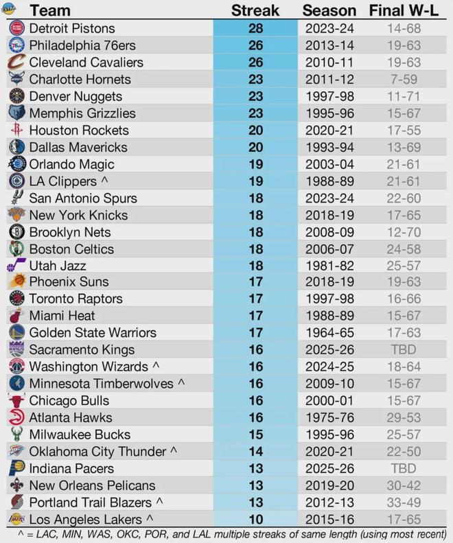 下面这张图有点意思,联盟各支球队的队史最长连败纪录:活塞28连败;76人和骑士都是26连败;黄蜂、灰熊和掘金则是23连败;火箭和独行侠是20连败。国王的16连败,根本排不到前列。湖人队史最长连败只有10连败,联盟最少。