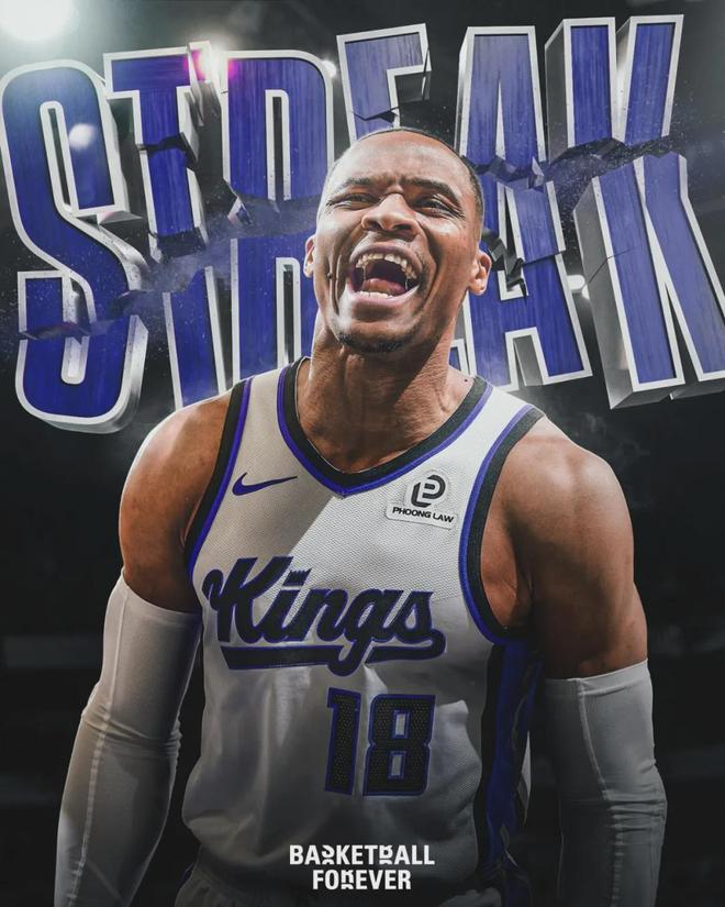 本赛季至今,威少为国王打了55场比赛,其中49场首发。场均出战28.9分钟,得到15.1分5.5篮板6.4助攻1.3抢断3.4失误,三项命中率:42.8%,34.3%,70.4%。得分、篮板和助攻都是近三年最高,三分命中率并列生涯第二高。
