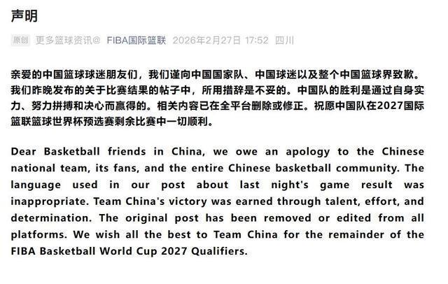 北京时间2月27日,国际篮联(FIBA)官方发布声明,就26日中国男篮对阵日本男篮赛后措辞不当一事,向中国男篮、球迷及中国篮球界正式致歉。