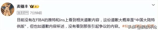 媒体人“麦穗丰”发文点评:目前没有在FIBA的推特和ins上看到相关道歉内容,这份道歉大概率是“中国大陆特供版”,但也如道歉内容所述,没有看到那条引起争议的内容。