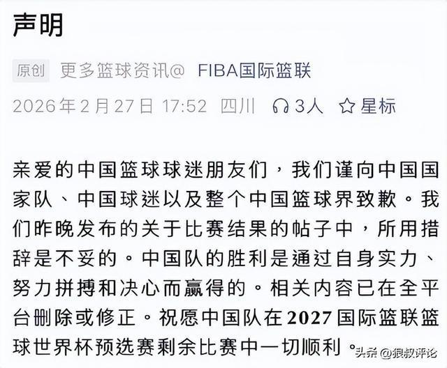 北京时间2月27日, FIBA国际篮联官方今日声明,因昨日比赛结果帖子的措辞不当而向中国男篮、中国球迷以及整个中国篮球界致歉。
