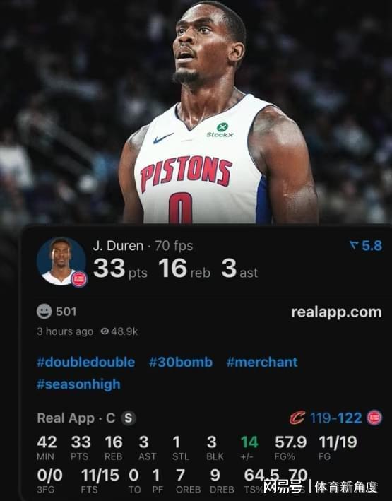 不过话说回来,这场比赛除了骑士的两大内线表现出色外,活塞的杜伦也是毫不逊色。他全场狂轰33分,还抢下了16个篮板,这豪华的两双数据,简直让人看得眼花缭乱。他和阿伦在禁区内的每一次对位、每一次攻防博弈,都成了比赛中最吸引人的看点,让人看得热血沸腾!