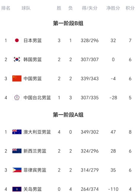 稍早时候结束的三场比赛,中国队100-93逆转中国台北队,日本队78-72击败韩国队,新西兰队99-67大胜关岛队。