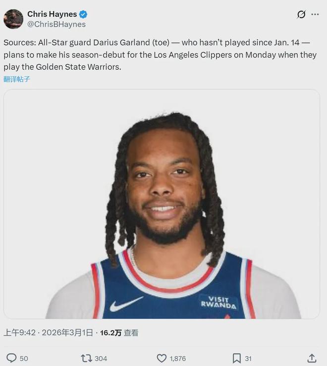 北京时间3月1日,据NBA名记Chris Haynes报道,快船全明星后卫达里厄斯-加兰,将在3月3日对阵勇士的比赛中迎来快船生涯首秀。过去一个半月,加兰一直在处理他的脚趾伤势。今年交易截止日被送到快船,但加兰还没出战过。