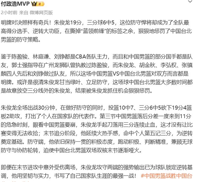 此役,担任中国队首发小前锋的朱俊龙表现堪称卓越,上场奋战30分钟,投篮10中7球,三分球6投5中,砍下全队最高的19分、4个篮板以及2次助攻,在中国队落后阶段多次命中底角三分帮助球队渡过难关,如同定海神针,帮助球队最终逆转台北,赛后朱俊龙也获得了球迷的高度好评,不少球迷和媒体人都将他评为中国队本场比赛的MVP。