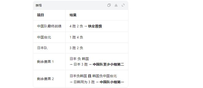 若余下一场中国台北赢韩国,他们最终可3胜晋级;韩国战绩来到2胜3负,中国队需指望韩国再输给日本,再与韩国比净胜分争晋级名额