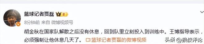 北京时间3月3日,根据篮球记者“贾磊”发文:胡金秋在国家队解散之后没有休息,回到队里立刻投入到训练中。王博指导表示,必须强制让他休息几天了。