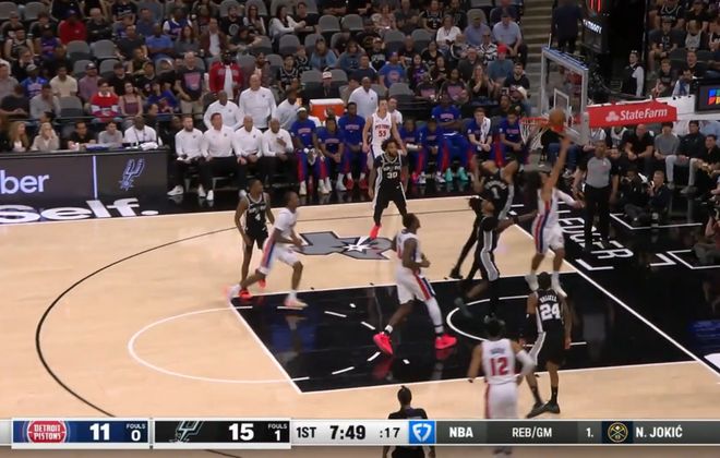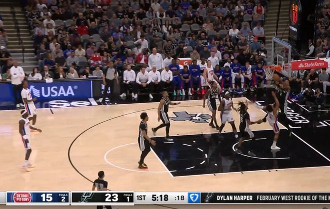 半场结束,文班亚马得到24分,他在第二节送出了一记惊艳四座的十佳球补扣,当时他一个假动作直接晃飞斯图尔特,然后连过多人突到篮下,上篮不进后,完成了一记补扣。