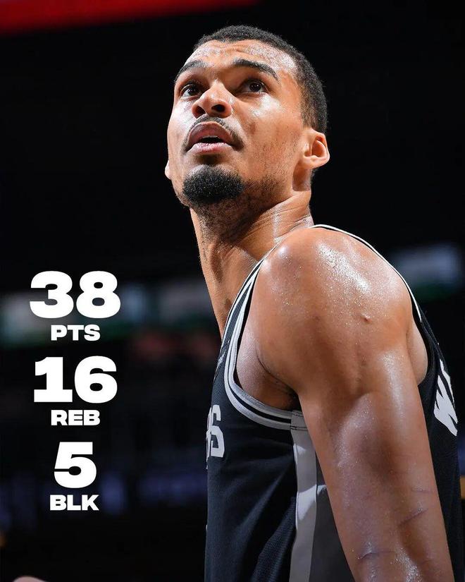 这场强强对话,文班亚马再次交出了MVP级别的表现:全场出战39分钟,投篮24中12,三分10中4,罚球11中10,拿下38分16篮板3助攻5盖帽,正负值+20。