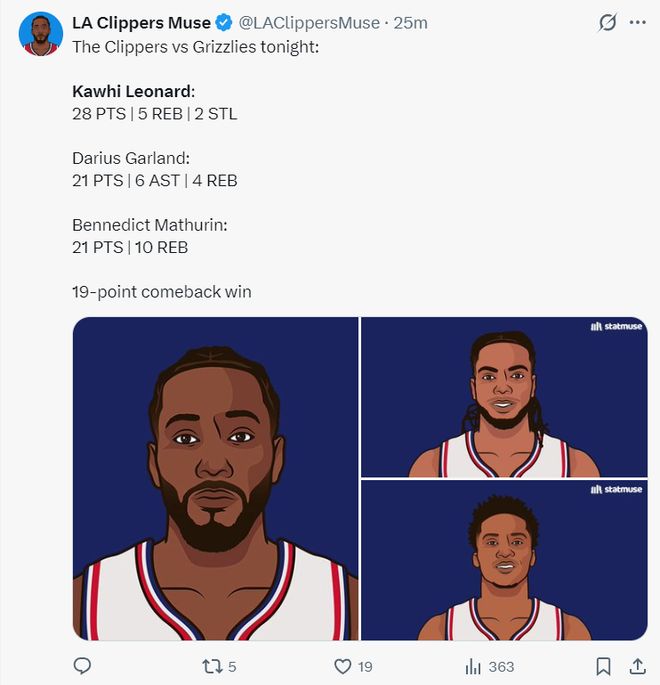 快船逆转灰熊19分创5大神奇数据:队史12年来首次+仅4记3分还能赢
