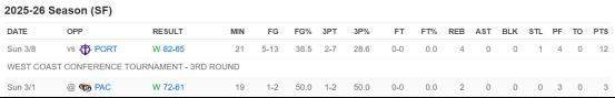 王俊杰近两周仅有2场比赛,在昨日对阵波特兰大学的赛区内锦标赛中,王俊杰在开局不利的情况下,下半场找回状态,全场13投5中得到12分4篮板1抢断,帮助球队晋级下一轮。不过在前一场比赛中,王俊杰机会不多仅有2次出手,得到3分2篮板。