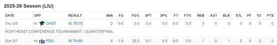 近两周,于泓凯依旧稳定获得出场机会,也很好地控制了犯规问题,四场比赛仅出现1次犯规。在赛区锦标赛四分之一决赛中,他出场11分钟得到4分2篮板,帮助球队加时击败对手晋级赛区半决赛,可惜球队不敌对手无缘晋级。后续若布拉德利未被邀请参加其余季后赛事,于泓凯本赛季的比赛就全部结束。
