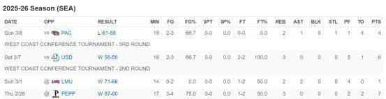西雅图大学也结束了赛区内锦标赛的比赛,淡厚然3投2中得到4分2篮板同时出现4次失误,没能帮助球队晋级下一轮。在上一轮的锦标赛中,淡厚然仅上场18分钟就五犯离场,得到6分3篮板。而在常规赛最后一场比赛中,淡厚然同样早早身背四次犯规,近期深陷犯规泥潭。不过在对阵佩珀达因的比赛中,淡厚然表现不错,4投3中得到7分3篮板。