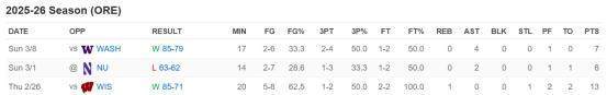 俄勒冈大学昨日结束了本赛季常规赛的最后一场比赛,上一场因手腕受伤缺席的林葳迎来复出,在最后11秒为埃文斯送出了扳平比分的助攻,全场比赛命中两记三分球得到7分4助攻。