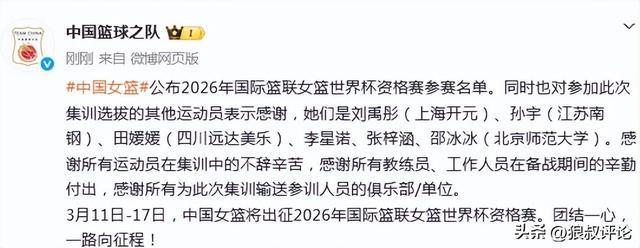 中国女篮官方发文: